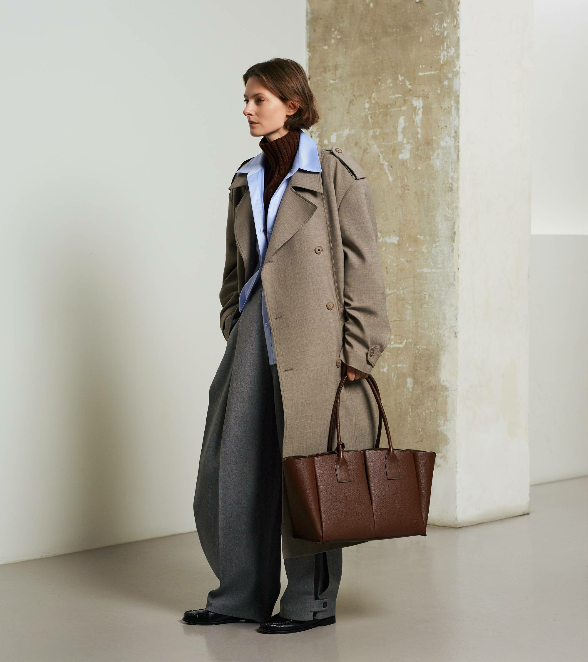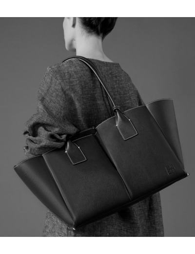 Grand sac cabas avec pochette amovible, miroir de courtoisie et marquage Le Tanneur ton sur ton. Doublure suède en microfibre. Porté main ou épaule.