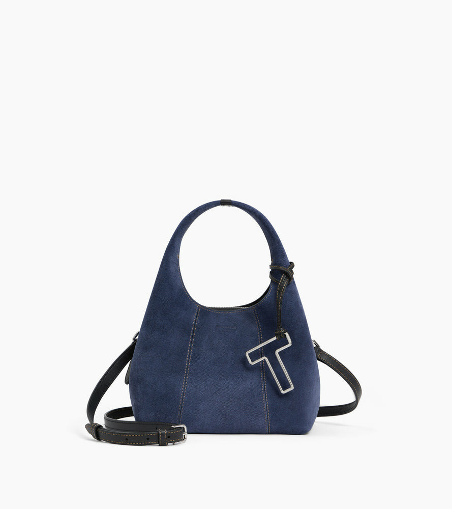 Petit sac à main en cuir suède effet denim avec charms T signature finition argent et marquage Le Tanneur ton sur ton. Porté main, épaule ou croisé grâce à sa bandoulière ajustable et amovible.