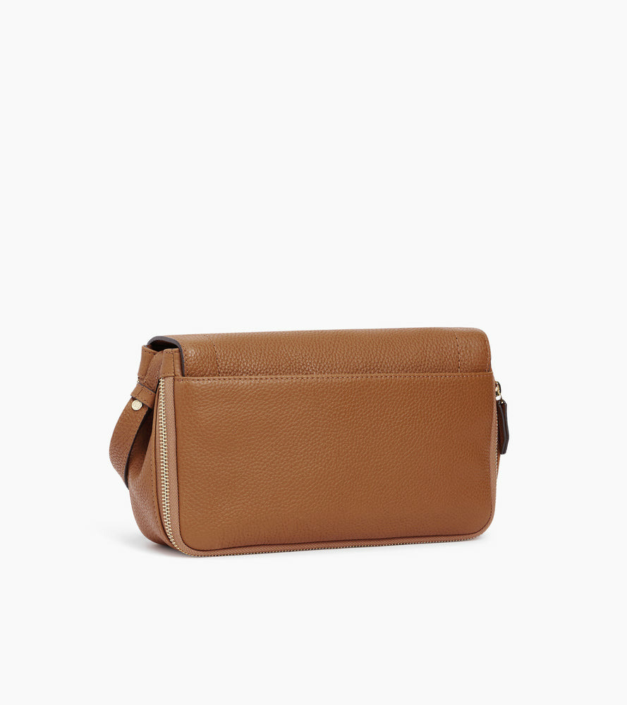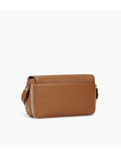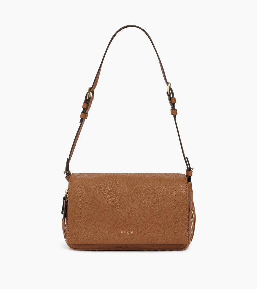 Besace à rabat petit modèle avec marquage Le Tanneur et doublure Crépuscule. Porté croisé ou épaule grâce à ses deux bandoulières ajustables.