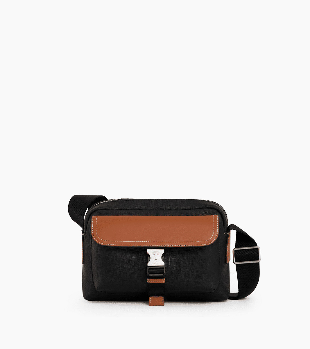 Petit sac bandoulière bi-matière avec fermoir T signature finition argent brossé et marquage Le Tanneur ton sur ton. Porté épaule ou croisé grâce à sa bandoulière ajustable.