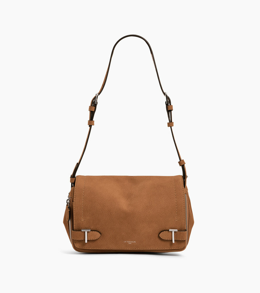 Petit sac bandoulière en cuir nubuck graine avec deux soufflets, doublure jacquard anniversaire, marquage Le Tanneur sur film argent et double T signature. Porté épaule ou croisé grâce à sa bandoulière ajustable.