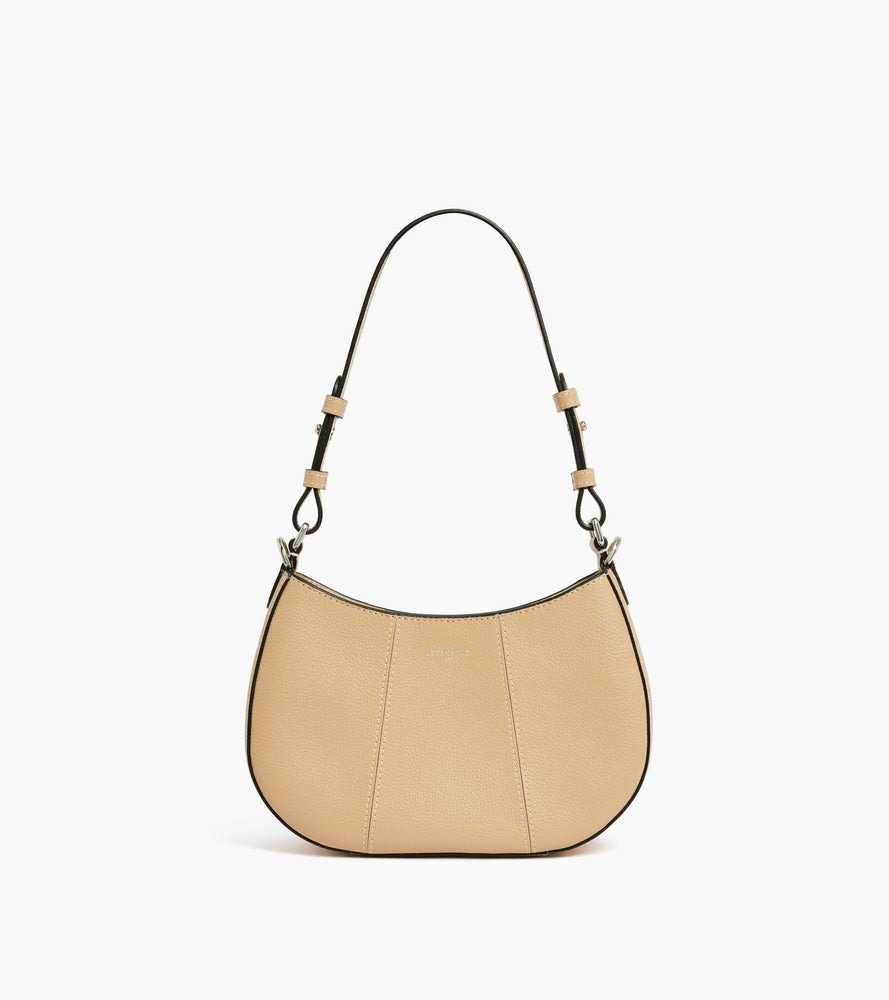 Petit sac demilune avec doublure jacquard crépuscule et marquage Le Tanneur. Double porté grâce à sa mini bandoulière porté épaule amovible et sa bandoulière porté croisé ajustable et amovible.