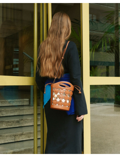 Petit sac seau bi-matière avec cordons de serrage et pièce signature gravée finition doré clair. Pochon coton amovible fixée au corps du sac par boutons-pression. Porté main, épaule ou croisé grâce à sa bandoulière ajustable et amovible.