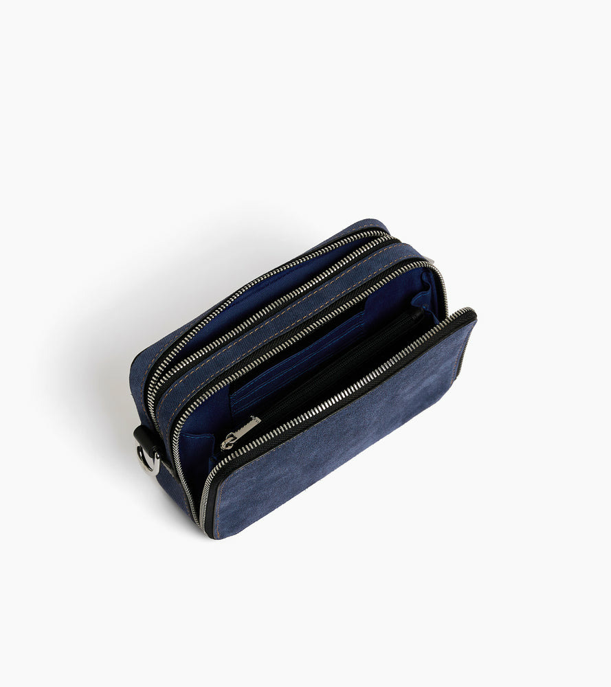 Cuir de veau refente de cuir suède effet denim. Doublure textile Le Bleu.