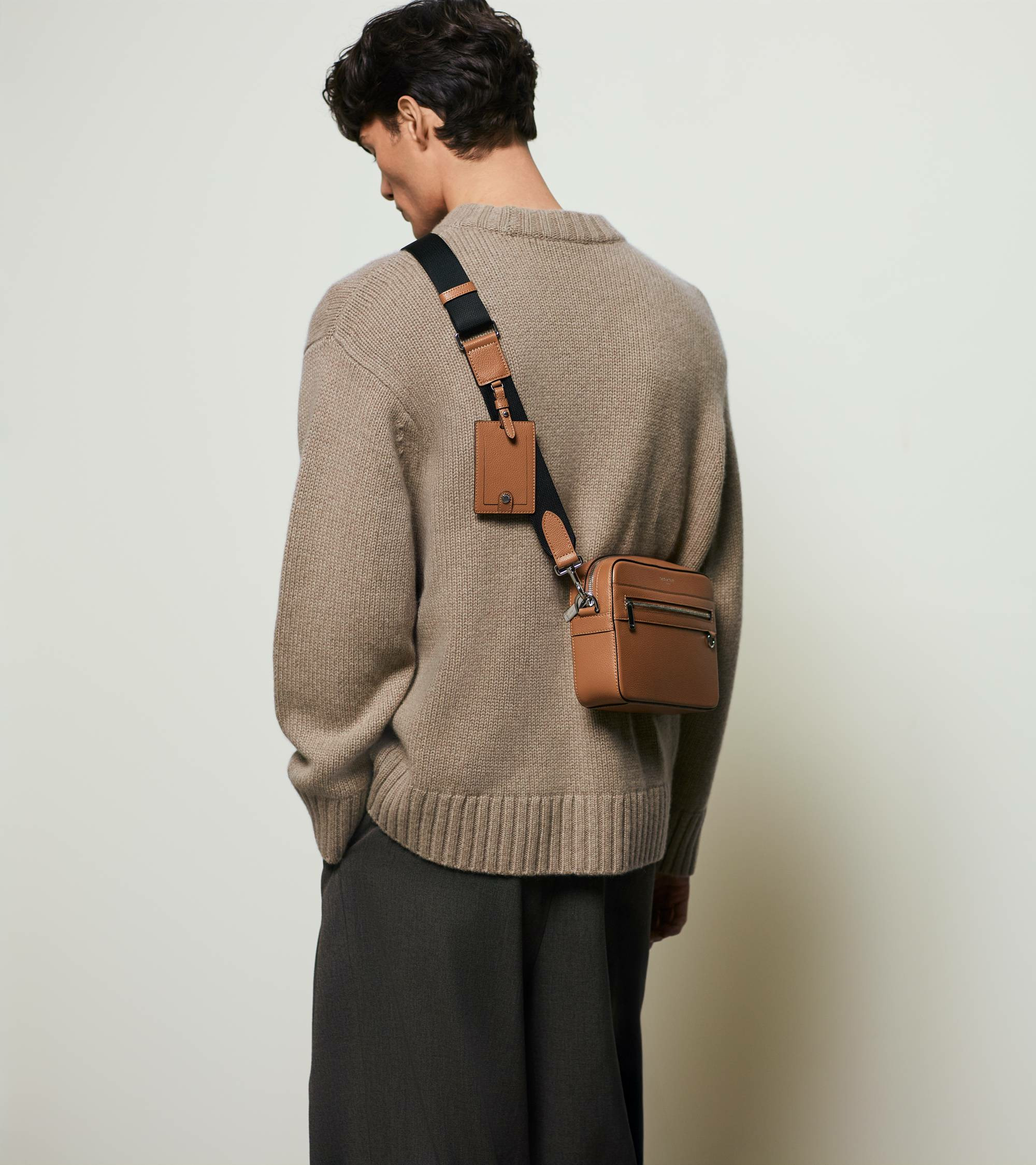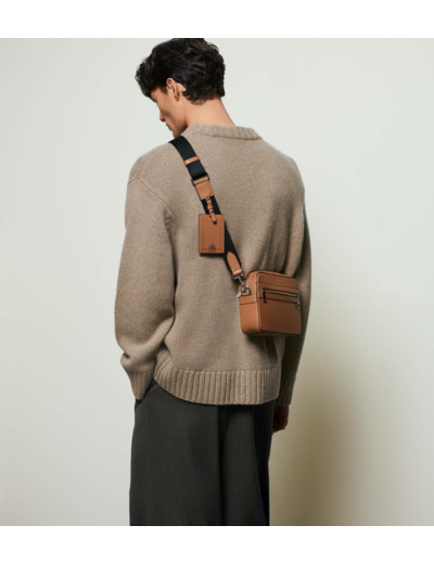 Camera bag marqué Le Tanneur avec portebadge amovible, doublure Le Bleu et éléments métalliques finition argent. Porté main, épaule ou croisé grâce à sa bandoulière ajustable et amovible.