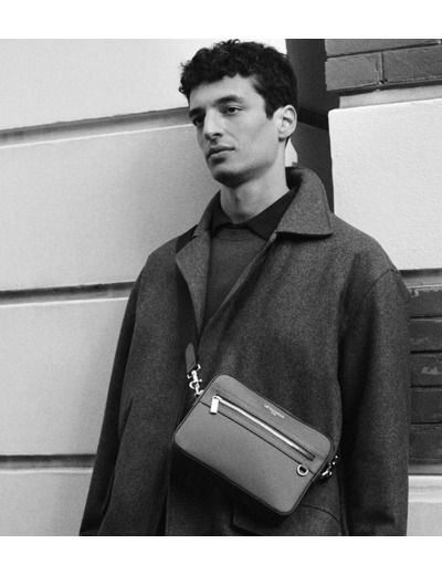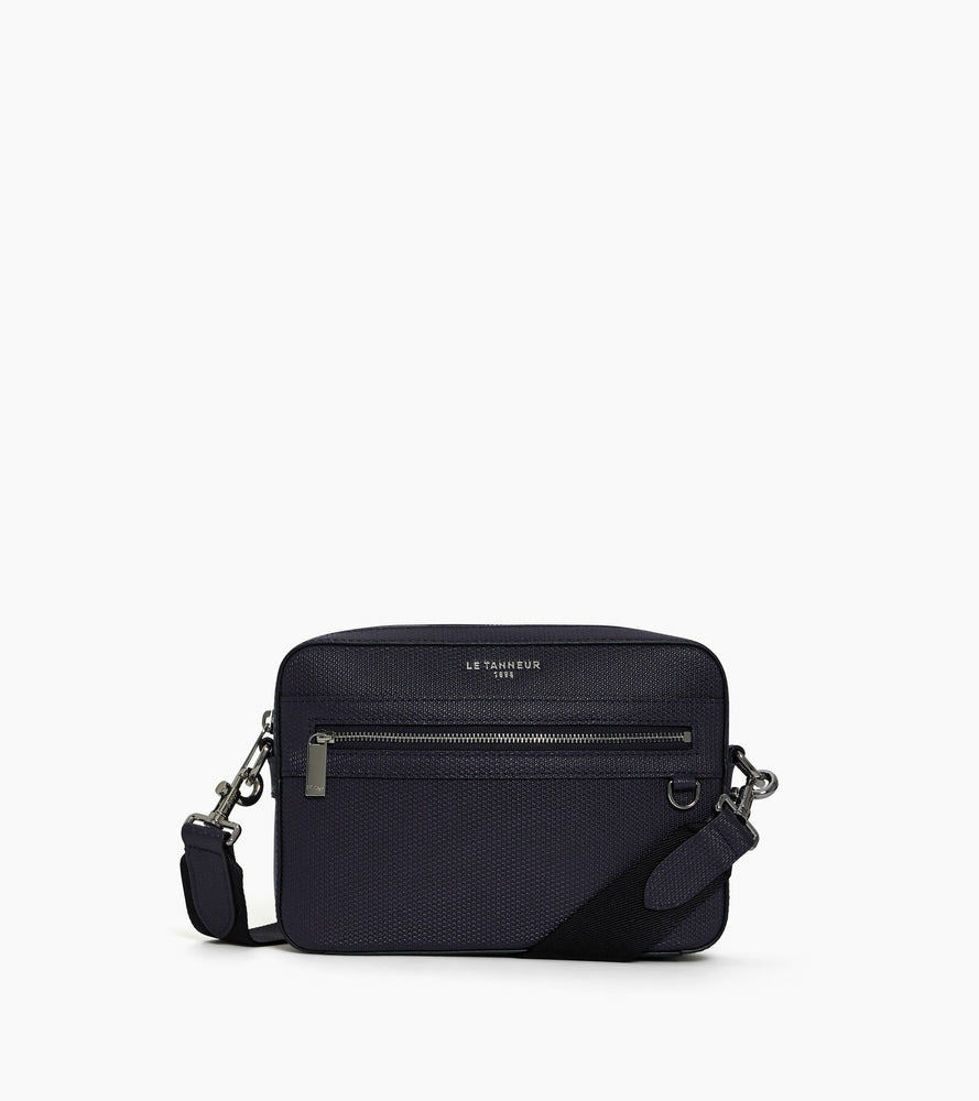 Camera bag marqué Le Tanneur avec porte-badge amovible et éléments métalliques finition argent. Porté main, épaule ou croisé grâce à sa bandoulière ajustable et amovible.