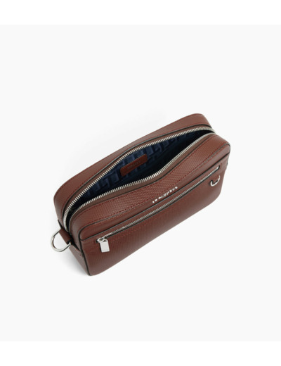 Camera bag marqué Le Tanneur avec portebadge amovible et éléments métalliques finition argent. Porté main, épaule ou croisé grâce à sa bandoulière ajustable et amovible.
