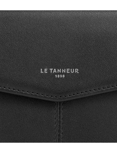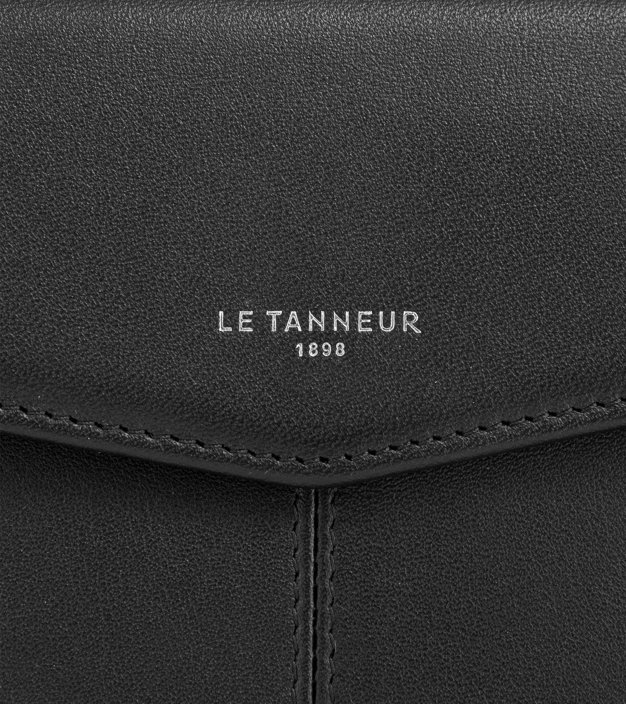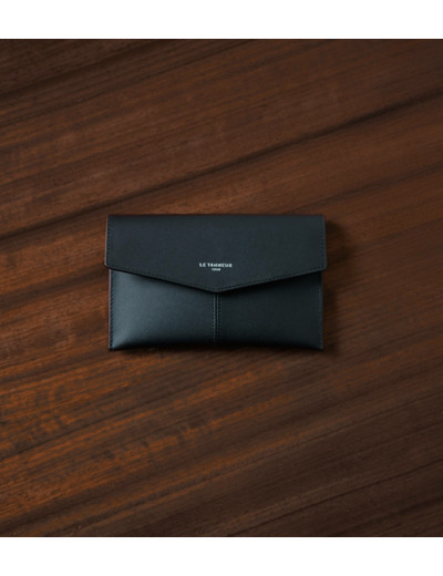 Pochette enveloppe avec fermeture pression et marquage Le Tanneur sur film argent.