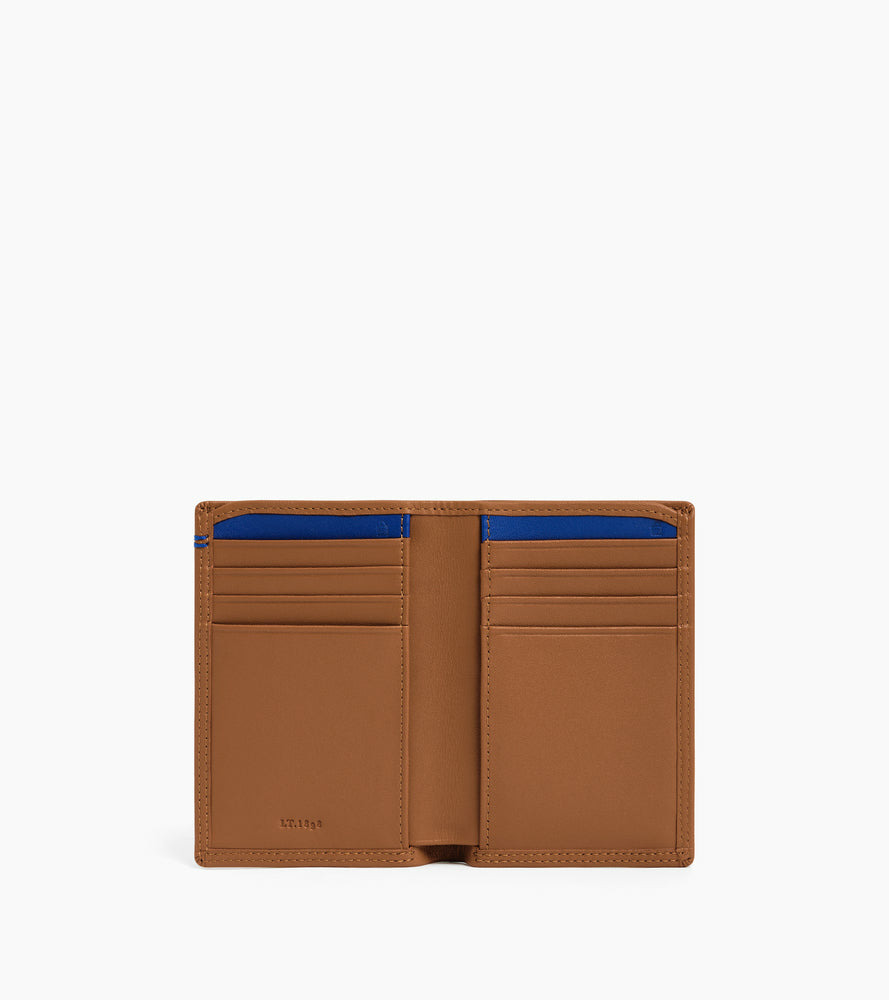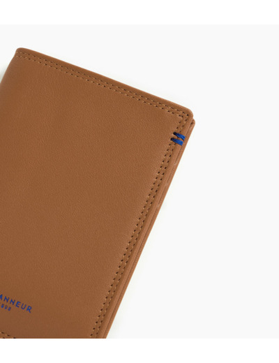 Portefeuille grand format vertical avec marquage Le Tanneur sur film Le Bleu, signature de la Maison. Double point contrasté cousu à la main. Dispose d'une sécurité anti-RFID.