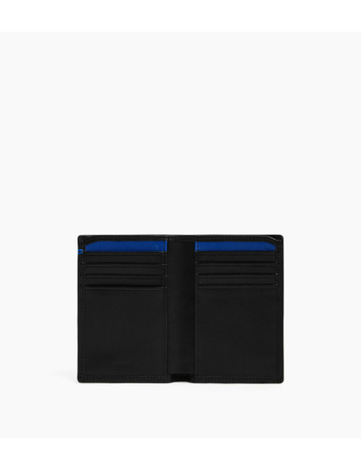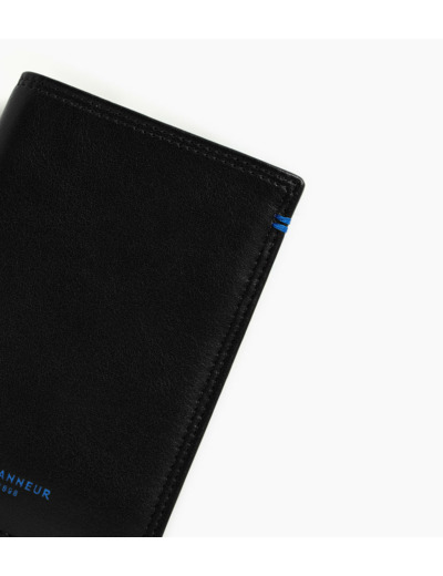 Portefeuille grand format vertical avec marquage Le Tanneur sur film Le Bleu, signature de la Maison. Double point contrasté cousu à la main. Dispose d'une sécurité anti-RFID.