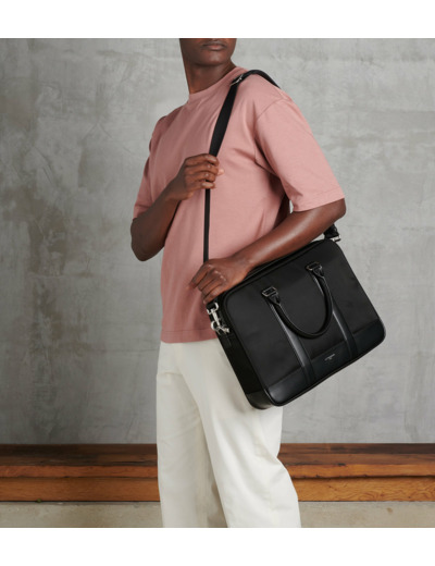 Porte-documents en toile polyamide avec renfort cuir. Bandes ajustées piquées en T, signature de la Maison. Portez-le à la main, croisé ou à l’épaule avec sa bandoulière amovible. Peut accueillir un ordinateur portable 15”.