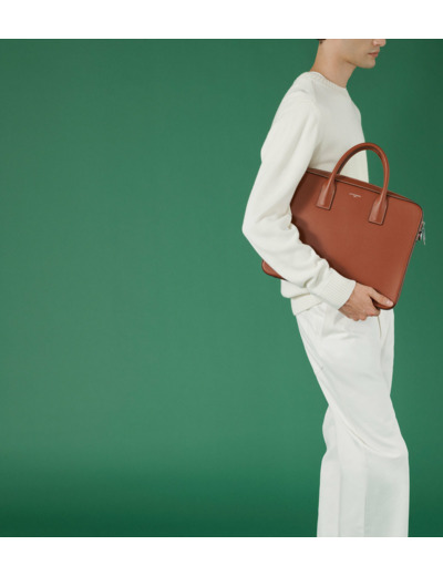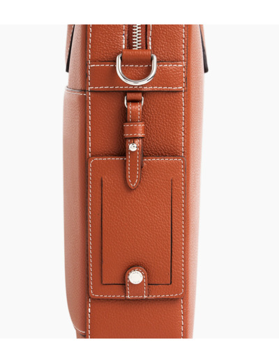 Porte-documents 14 finition argent avec poche ordinateur, passant trolley, charms amovible et marquage Le Tanneur sur film argent. Porté main, épaule ou croisé grâce à sa bandoulière ajustable et amovible."
