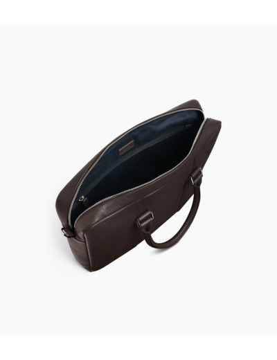 Porte-documents slim avec poche ordinateur 13-14", bouclerie gravée et marquage Le Tanneur ton sur ton. Doublure 100% coton bleu marine. Porté main, épaule ou croisé grâce à sa bandoulière ajustable et amovible.