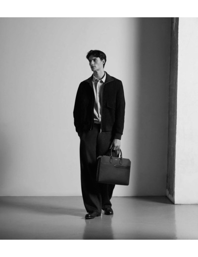 Cuir de vachette pleine fleur grain croisé et lisse. Doublure textile jacquard noir.