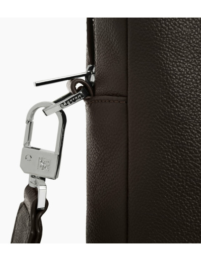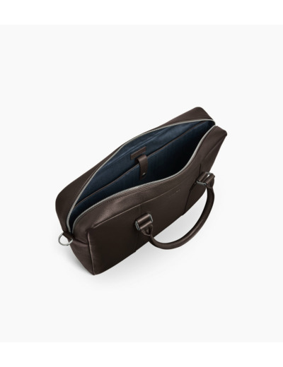 Porte documents avec poche ordinateur 14-15", éléments métalliques gravés finition canon de fusil et marquage Le Tanneur ton sur ton. Doublure 100% coton bleu marine. Porté main, épaule ou croisé grâce à sa bandoulière ajustable et amovible.