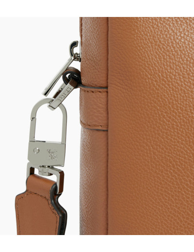 Porte documents avec poche ordinateur 14-15", éléments métalliques gravés finition canon de fusil et marquage Le Tanneur ton sur ton. Doublure 100% coton bleu marine. Porté main, épaule ou croisé grâce à sa bandoulière ajustable et amovible.