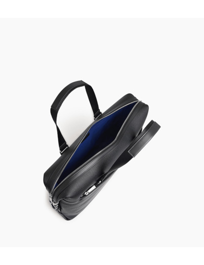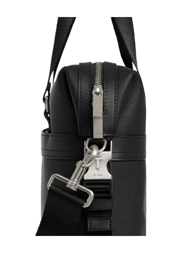 Porte-documents avec empiècement cuir embossé Le Tanneur et éléments métalliques finition argent brossé. Porté main, épaule ou croisé grâce à sa bandoulière ajustable et amovible.