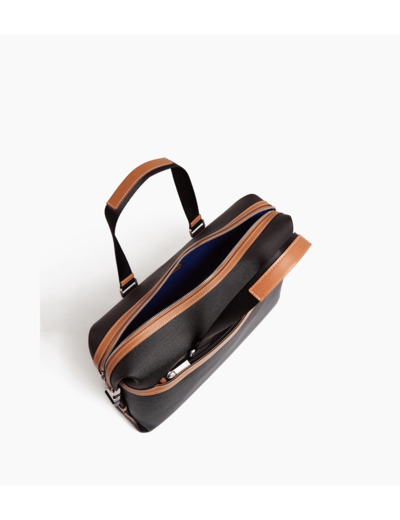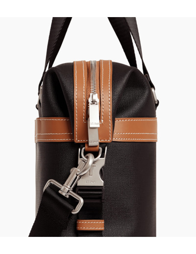 Porte-documents avec empiècement cuir embossé Le Tanneur et éléments métalliques finition argent brossé. Porté main, épaule ou croisé grâce à sa bandoulière ajustable et amovible.