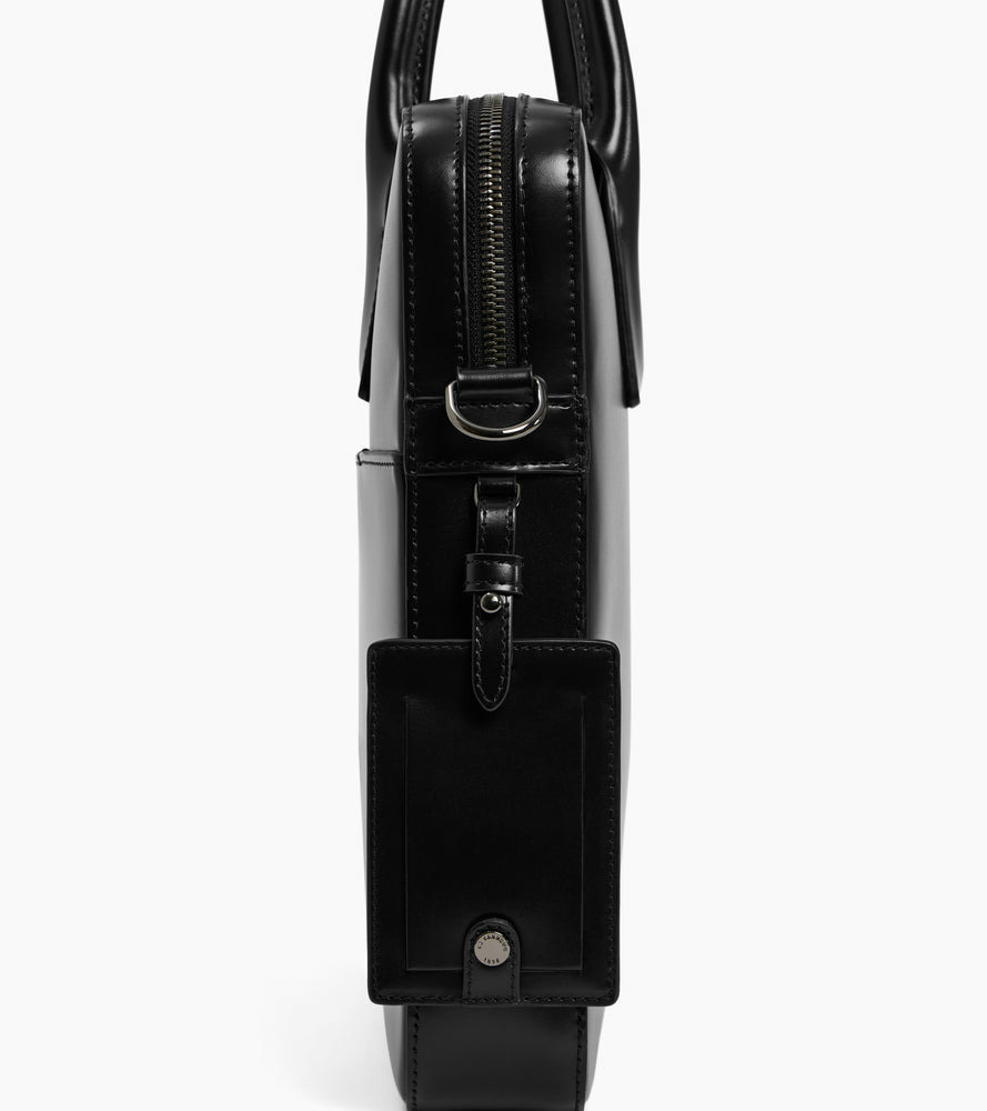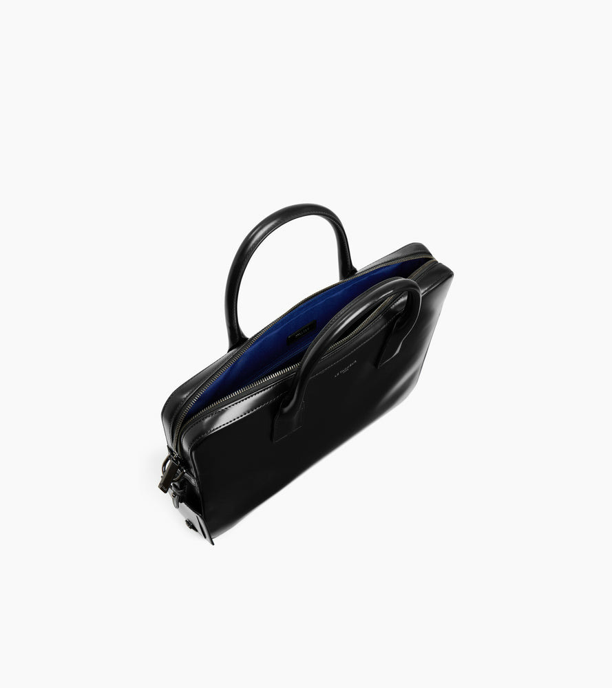 Porte-documents slim finition canon de fusil avec poche ordinateur 14", passant trolley, charms amovible et marquage Le Tanneur sur film argent. Porté main, épaule ou croisé grâce à sa bandoulière ajustable et amovible."