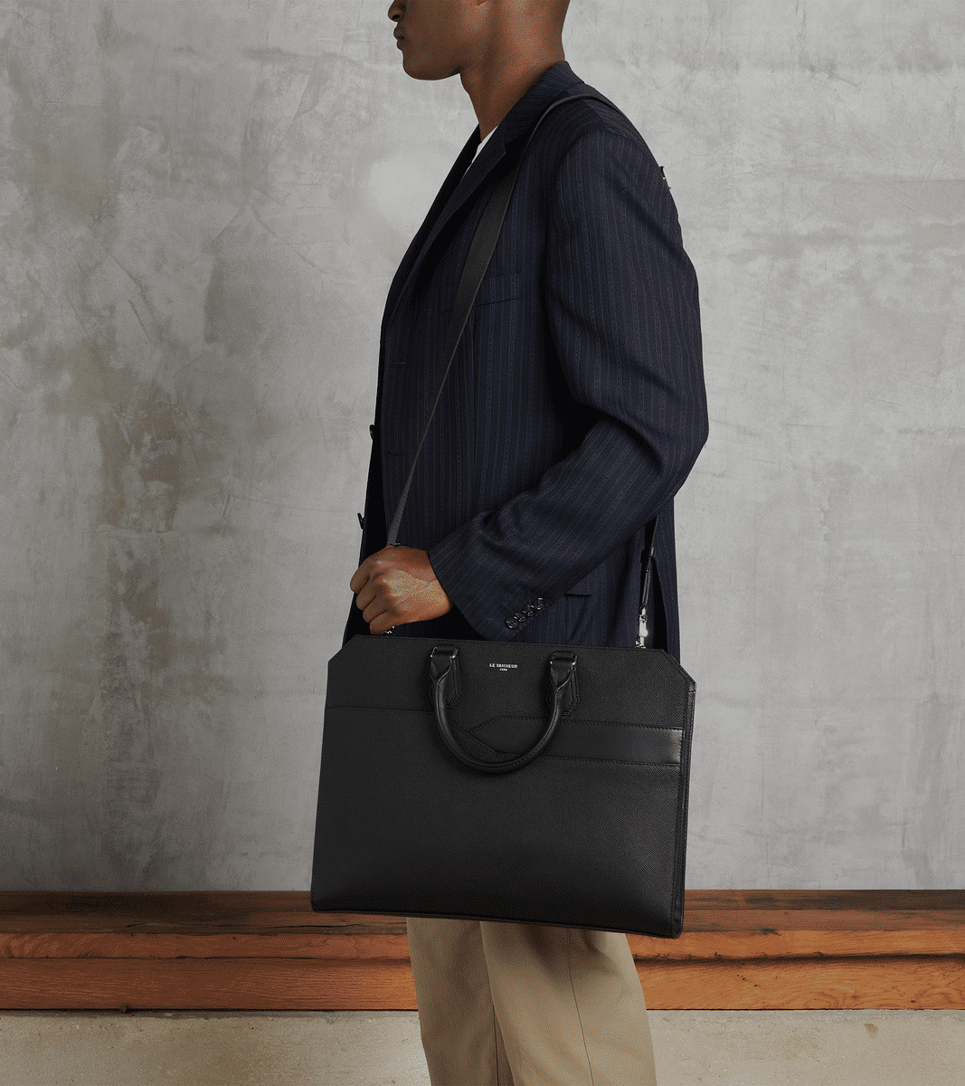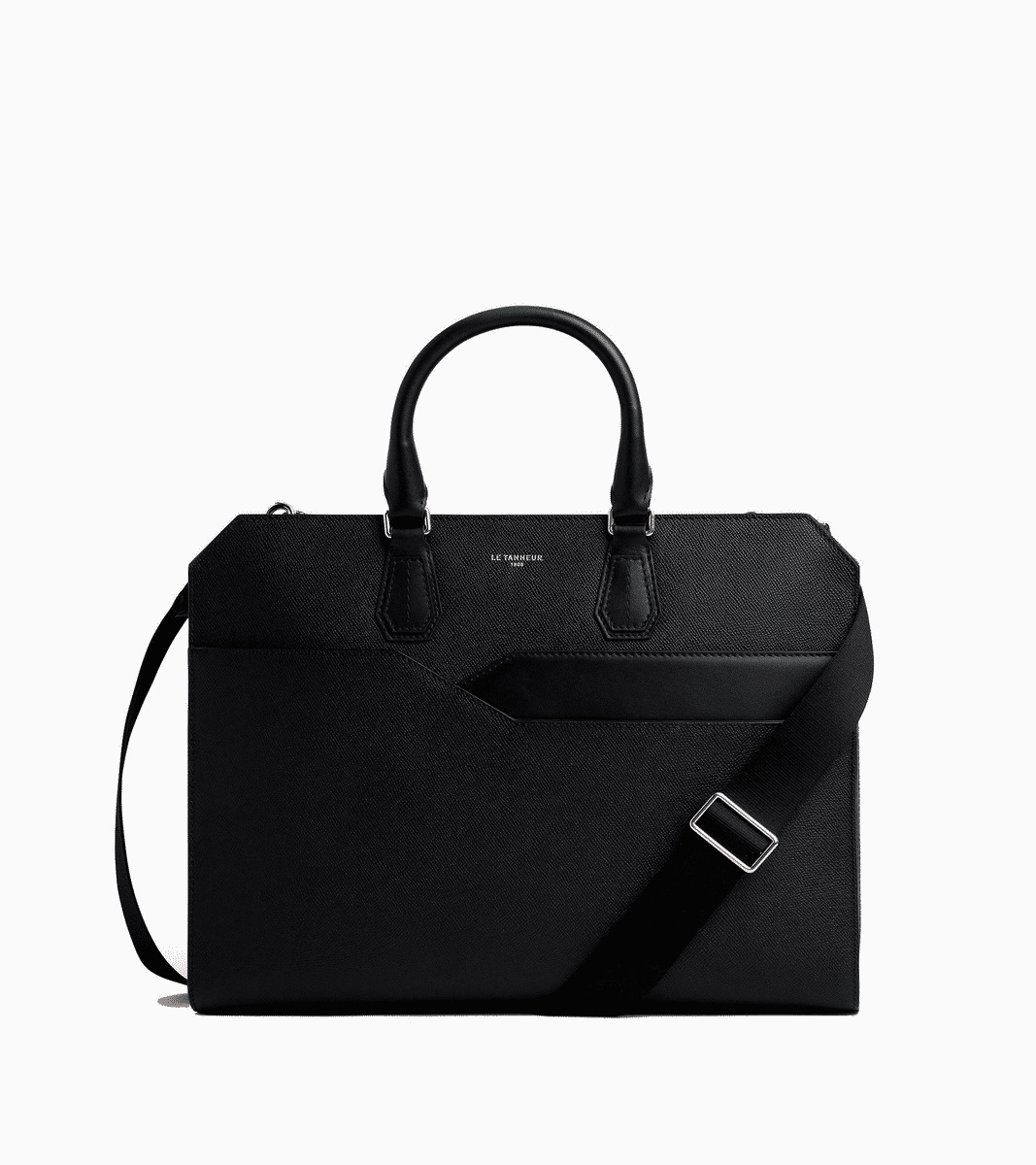 Porte-documents slim avec poche ordinateur 15. Marquage Le Tanneur et éléments métalliques finition argent. Porté main, épaule ou croisé grâce à sa bandoulière ajustable et amovible."
