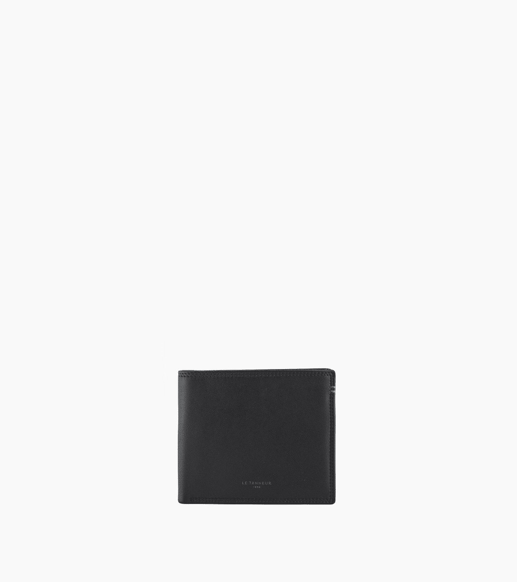 Ce portefeuille deux volets avec poche monnaie à rabat arbore un discret marquage Le Tanneur couleur Le Bleu, ainsi qu’un double point du même contraste cousu à la main.