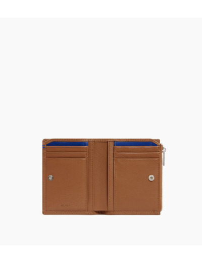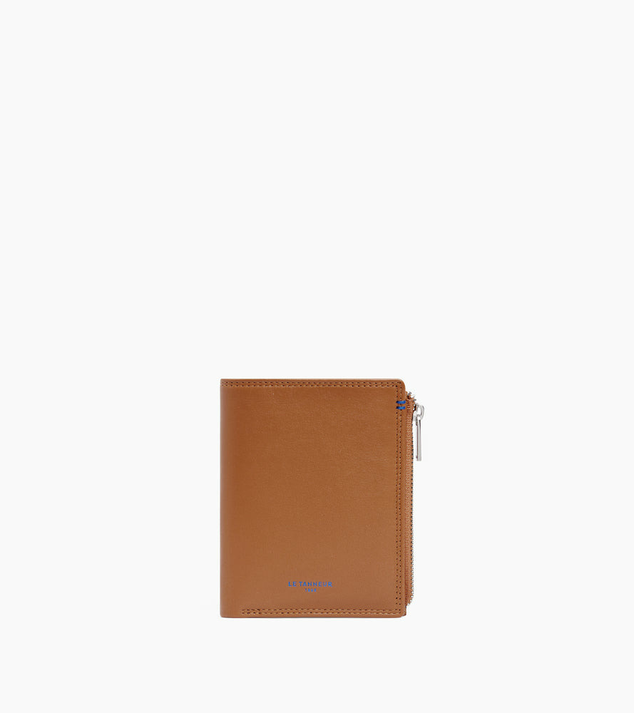 Portefeuille vertical deux volets avec marquage Le Tanneur, fermoir pression et poche monnaie zippée finition argent. Intérieur et points bleu signature. Sécurité anti-RFID.