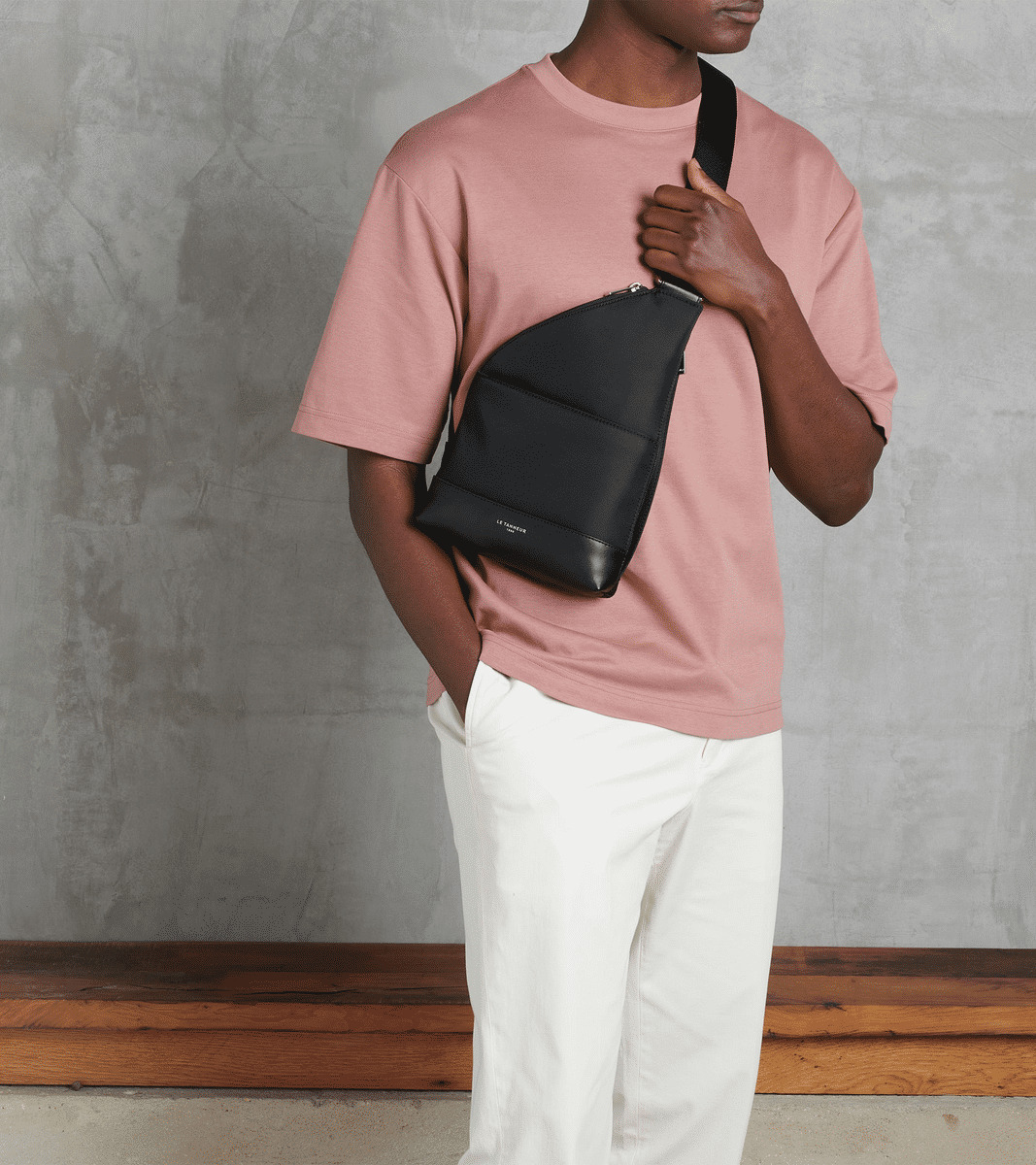 Sac à dos mono bretelle en toile polyamide avec renfort en cuir. Ce modèle possède un marquage Le Tanneur ton sur ton. Bandoulière est ajustable.