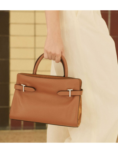 Sac à main bi-matière avec fermoirs T signature, poignées toron et logo Le Tanneur embossé ton sur ton. Porté main, épaule ou croisé grâce à sa bandoulière ajustable et amovible.