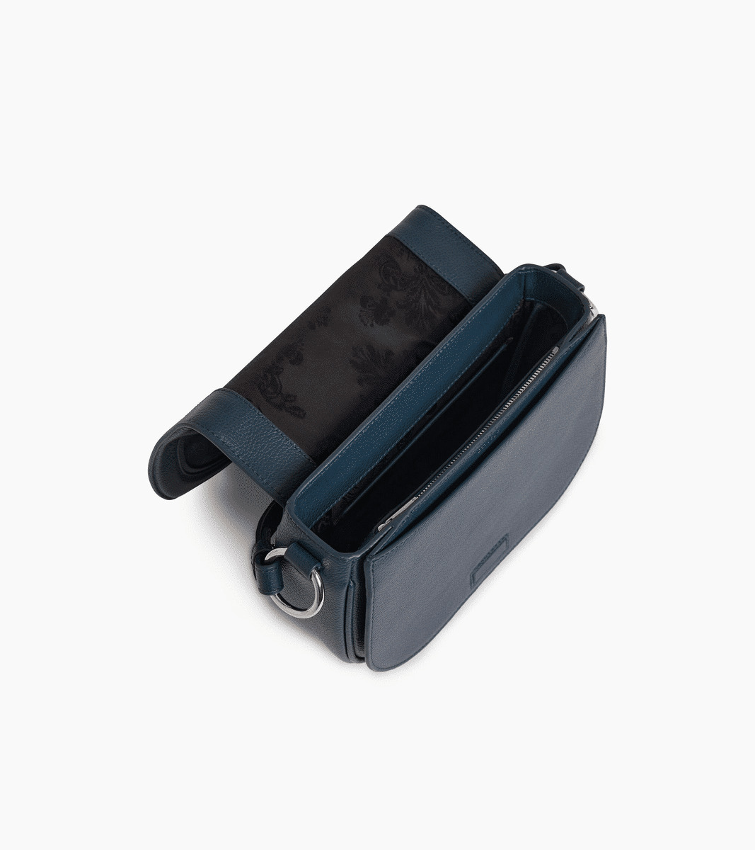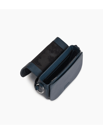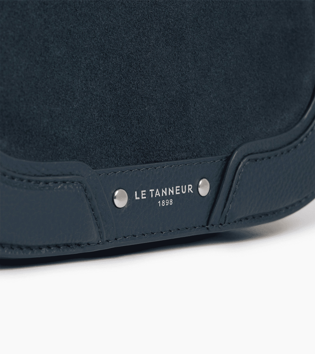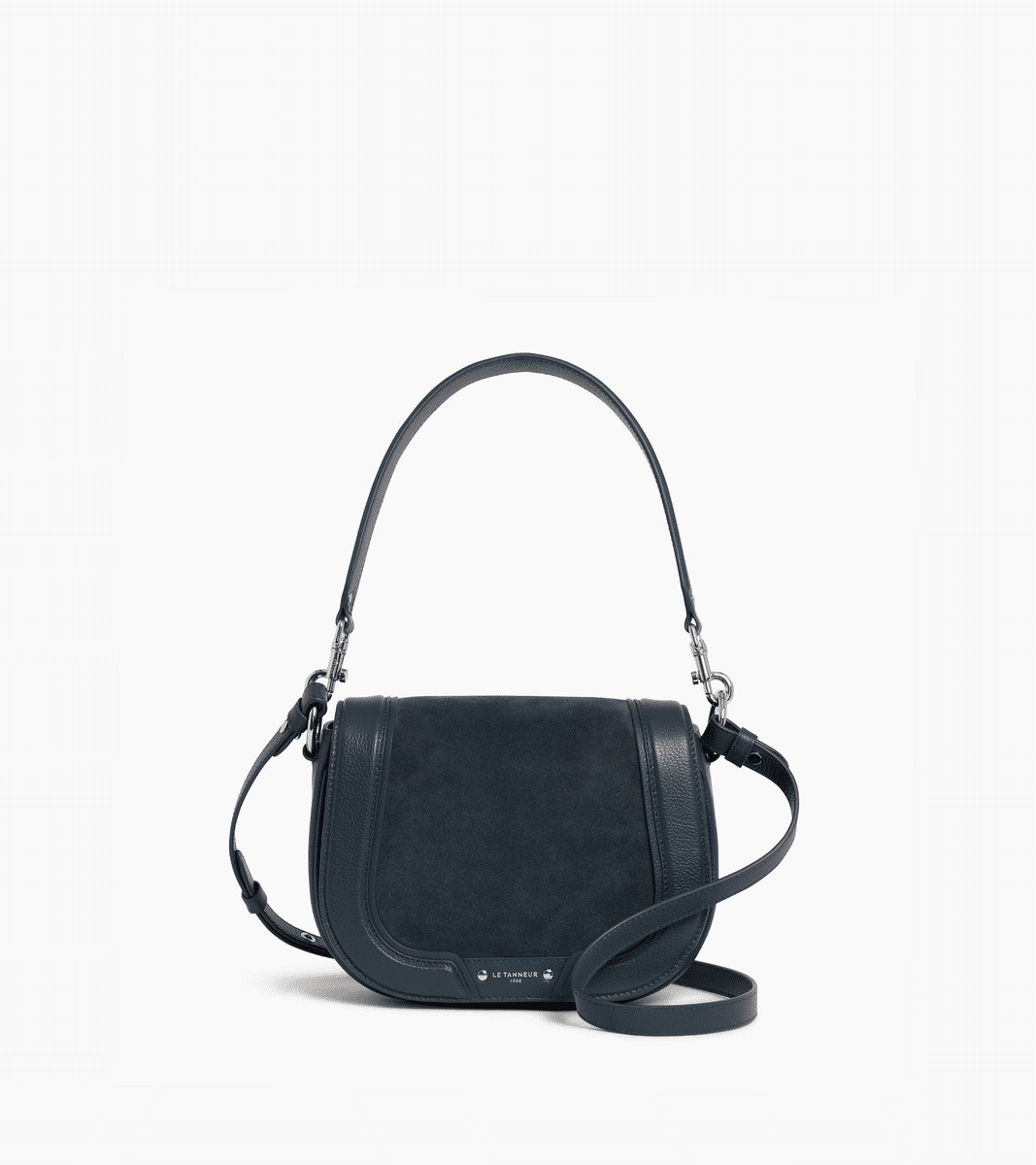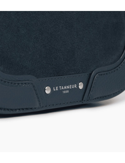 Besace moyen modèle en cuir grainé et nubuck, avec fermeture aimantée, marquage Le Tanneur et intérieur jacquard anniversaire 125 ans. Porté main, croisé ou épaule grâce à sa bandoulière ajustable et sa poignée amovible ajustée au corps du sac.