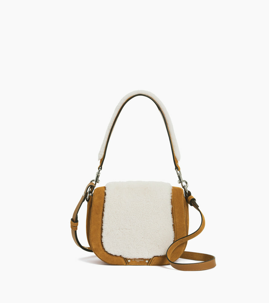 Besace moyen modèle en cuir grainé et peau lainée, avec fermeture aimantée, marquage Le Tanneur sur film argent et intérieur jacquard anniversaire 125 ans. Porté main, croisé ou épaule grâce à sa bandoulière ajustable et sa poignée amovible ajustée au corps du sac.