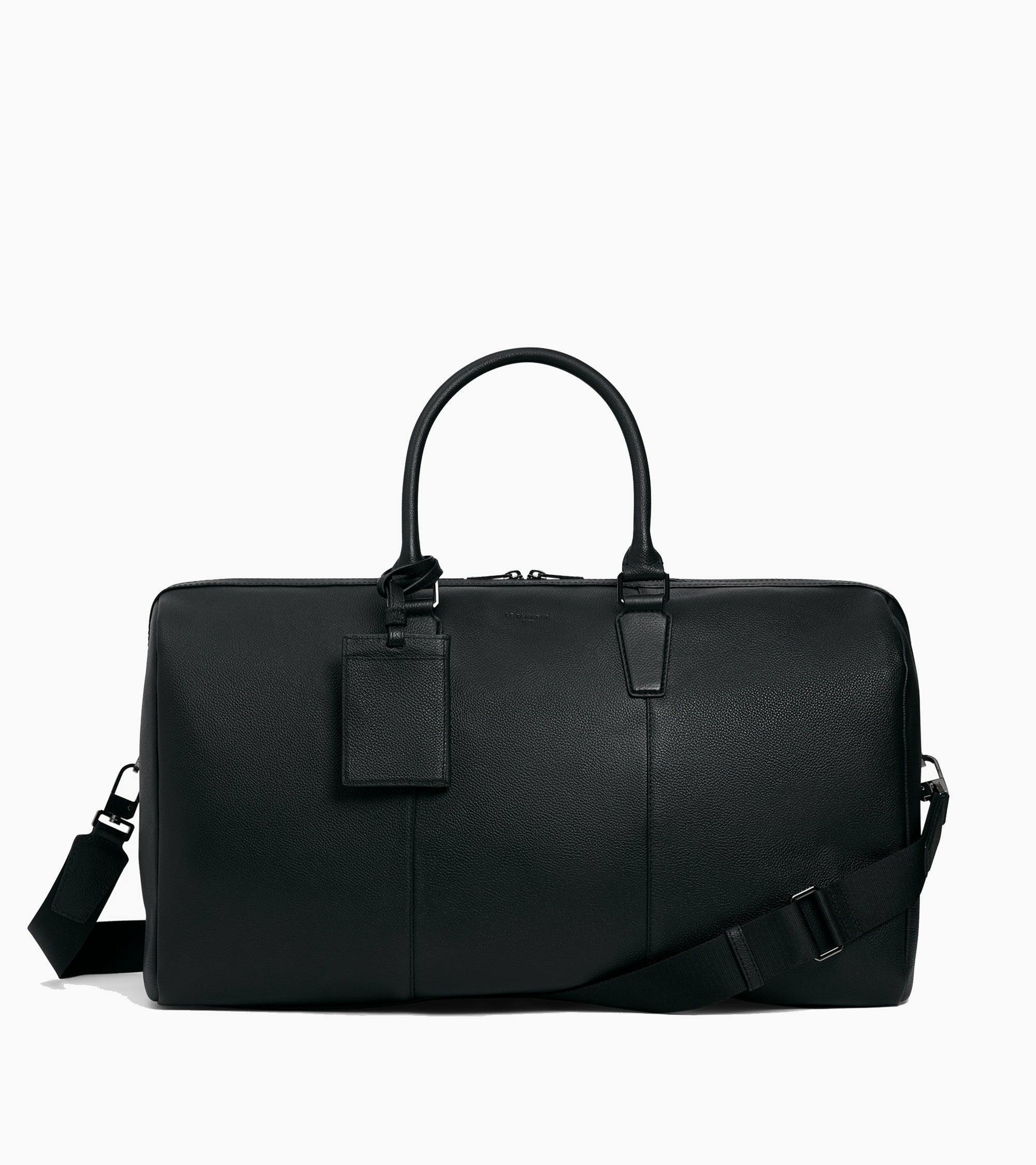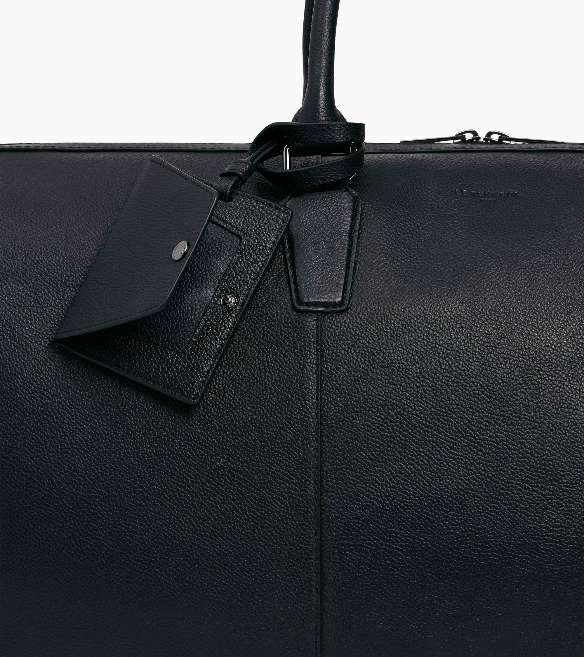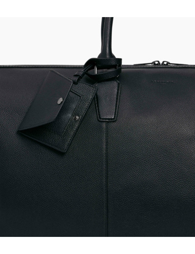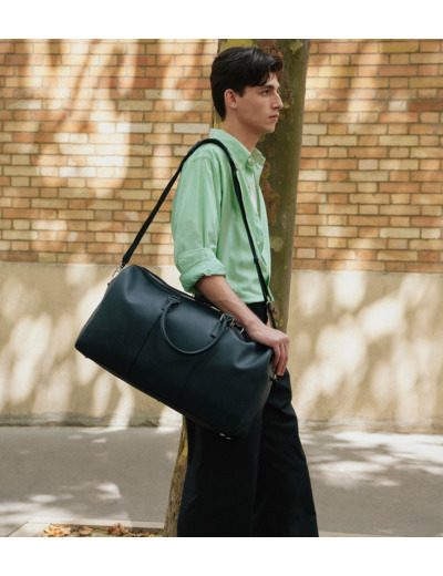 Sac de voyage 48h avec poignées rigides, porte-étiquette amovible et bouclerie gravée signature. Porté main, épaule ou croisé avec sa bandoulière ajustable amovible.