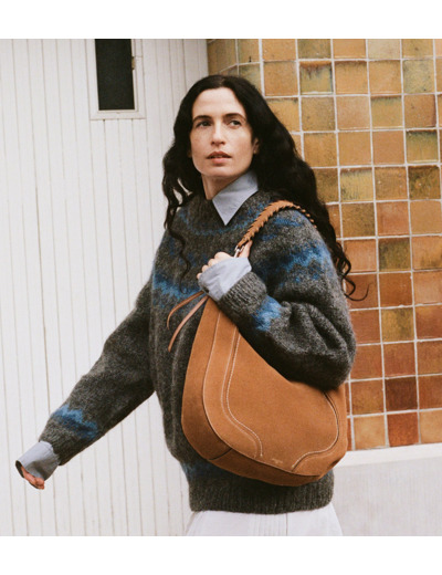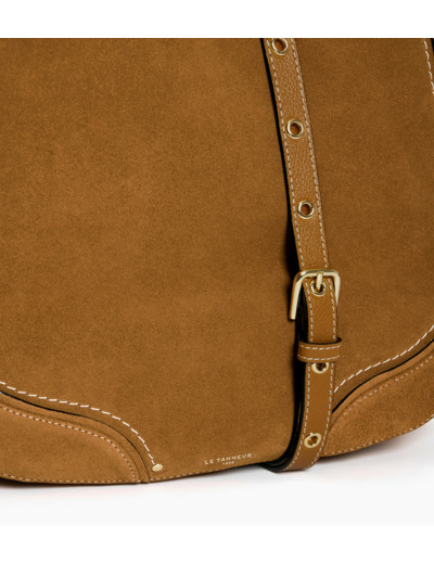 Sac hobo souple moyen modèle en cuir grainé et nubuck, avec marquage Le Tanneur et intérieur jacquard anniversaire 125 ans. Porté épaule ou croisé grâce à sa poignée amovible et à sa bandoulière ajustable.