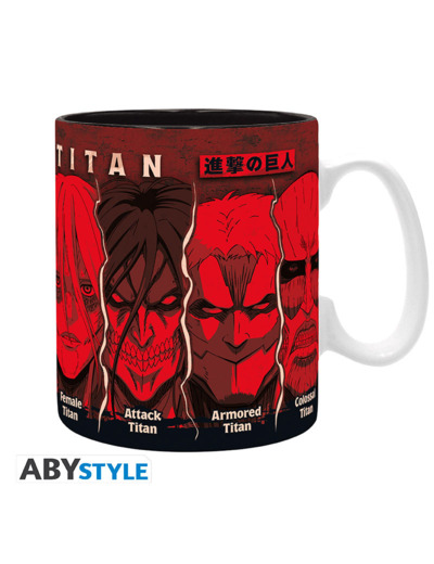 Affrontez la puissance des Titans avec ce mug 460 ml L’Attaque des Titans par ABYstyle, réunissant les colosses emblématiques de la série !