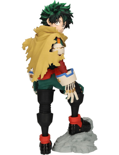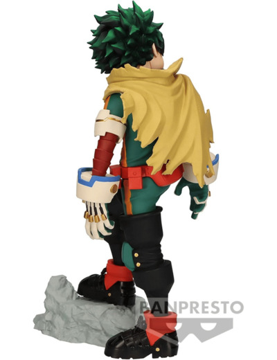 Izuku est représenté avec un regard déterminé, revêtu de la cape jaune emblématique de Gran Torino. De dos, son regard est tourné vers l'arrière, témoignant de sa vigilance constante. Un pied posé sur un rocher, sa prestance dégage une assurance différente de celle du petit Deku que l'on a connu, désormais transformé en un héros confiant et résolu.
