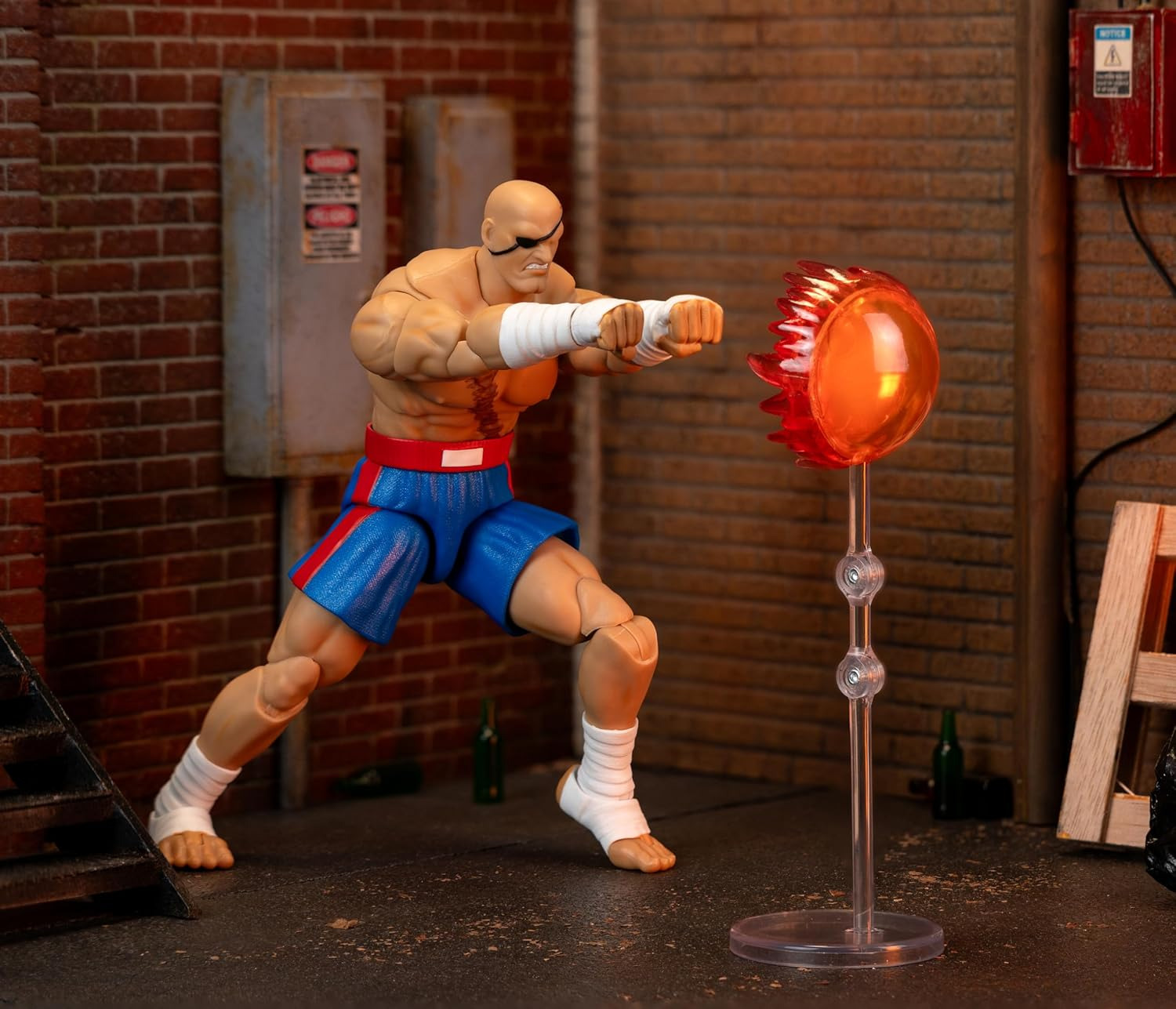 Évoquant la stature massive du maestro du Muay Thai, cette figurine représente Sagat avec son cache-œil emblématique, son pantalon traditionnel et la cicatrice sur sa poitrine, souvenir de son rival RYU. Emballée dans une boîte style jeu d'arcade originale, cette figurine est le choix parfait pour les fans de la franchise.