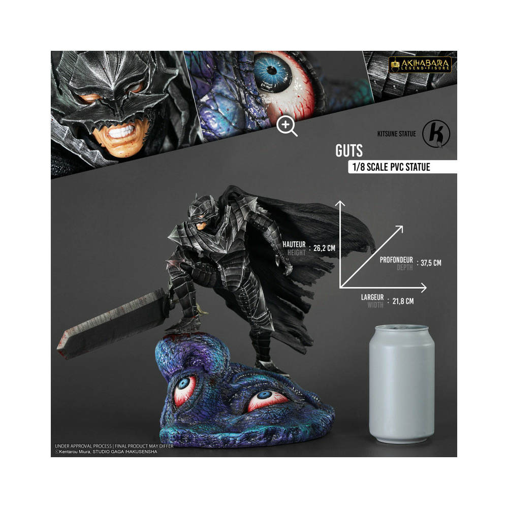 Fabriquée en PVC, cette figurine de Guts mesure 26,6 cm de hauteur par 21,8 cm de largeur pour 37,5 cm de profondeur.