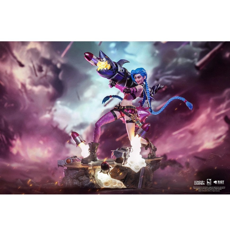 Jinx rejoint les champions de League of Legends de PureArts ! Dans son skin original emblématique, Jinx est en action avec son lance-roquettes Fishbones. Son pistolet à impulsion Zapper et son minigun Pow-Pow sont à ses côtés et prêts à être utilisés au combat. Des lumières LED réparties sur l'ensemble de la statue donnent vie aux détails.