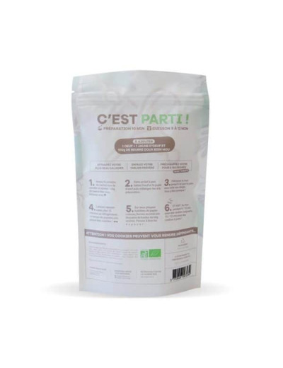 Composition : Ingrédients kit préparation bio cookies chocolat blancFarine de blé* des Moulins de Brasseuil, cassonade*, chocolat blanc (min. 32%)* 12% (sucre de canne*, beurre de cacao*, poudre de lait entier*), sucre mascobado*, sucre blanc*, sel, poudre à lever, bicarbonate de sodium. Peut contenir des traces éventuelles de soja et de fruits à coque. *Ingrédients certifiés agriculture biologique.ConservationDDM 9 mois minimum. Nous vous recommandons de conserver vos kits préparation à température ambiante.La petite astuce !Répartissez vos pâtons sur deux plaques de cuissons pour laisser la pâte s’exprimer librement !