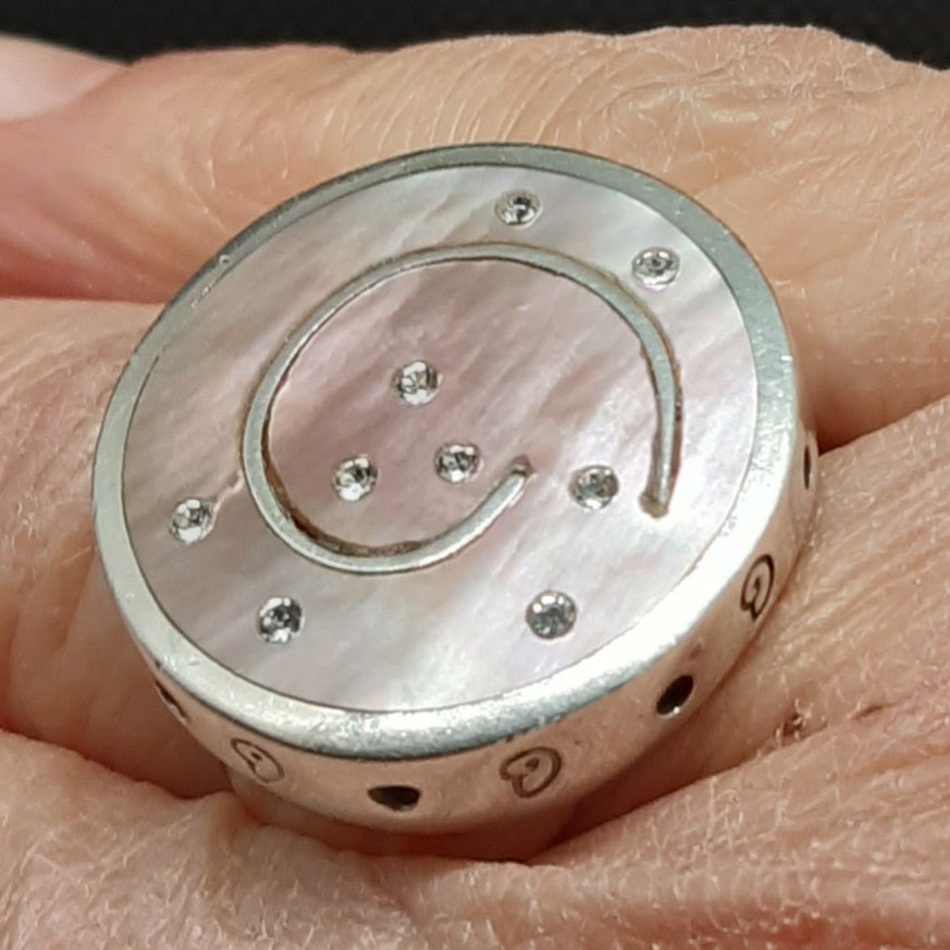 Très belle bague en ARGENT (poinçonnée) présentant un disque en nacre abalone ( ormeau en français) , offrant un nuancier de couleurs irisées.