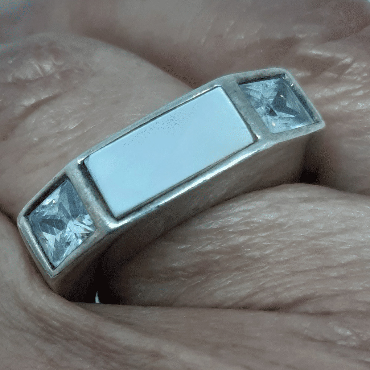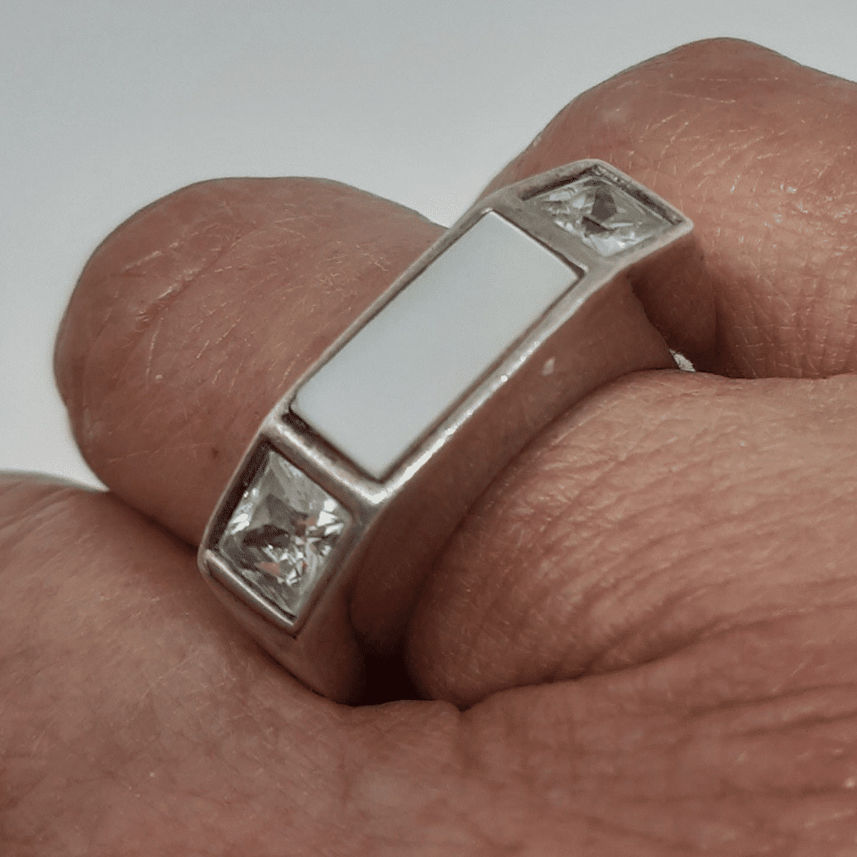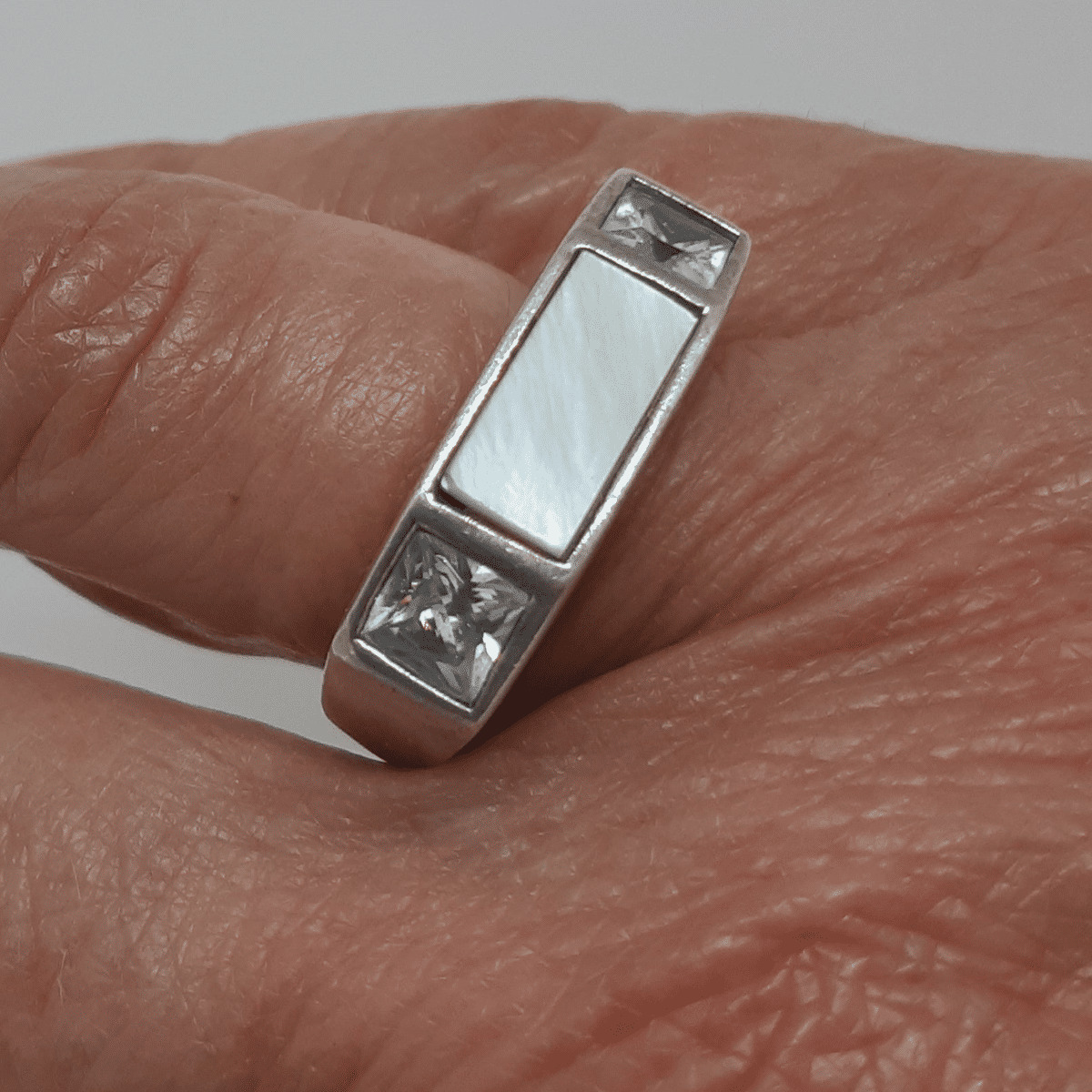 Bague en ARGENT (poinçon), de style Art Déco, présentant une barrette rectangulaire en nacre entouré de jolis strass