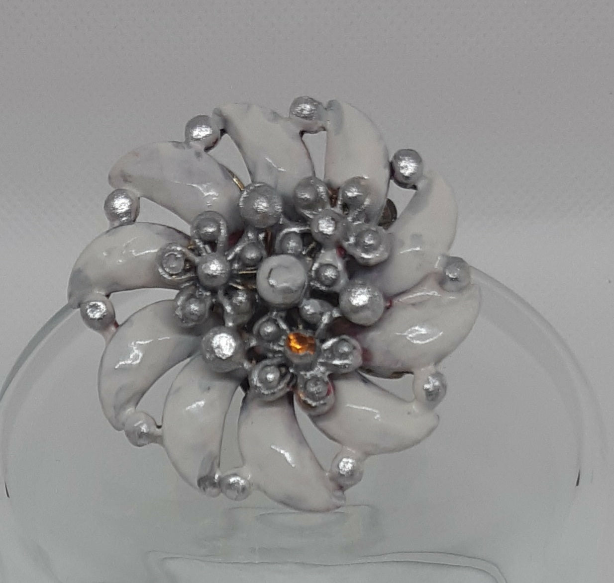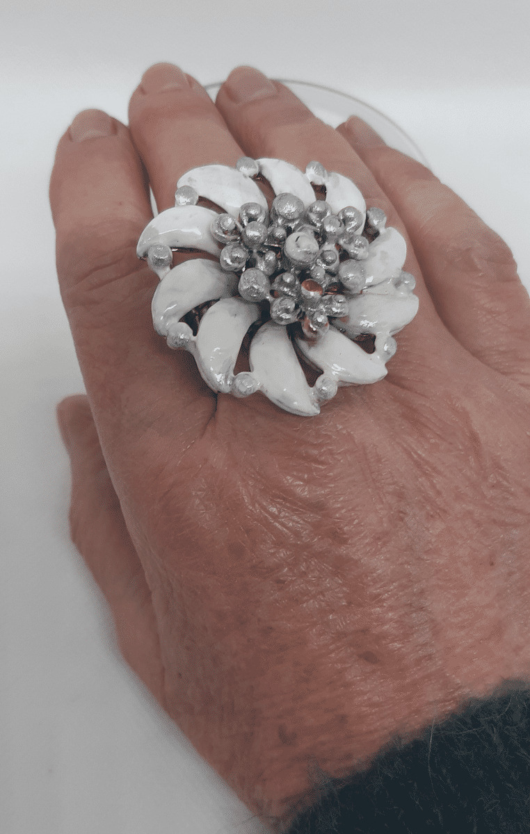 Bague vintage de scène représentant une grande fleur en métal émaillé de couleur blanche