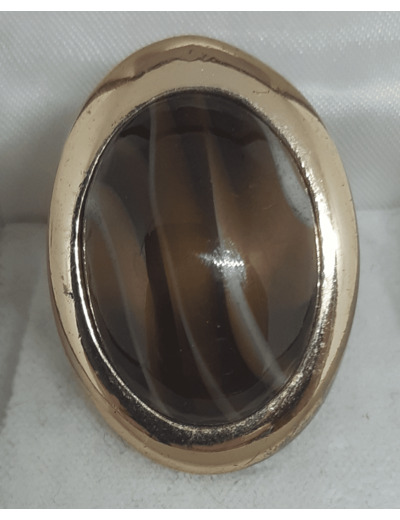 Grande bague vintage de marque LANVIN ornée d'un gros cabochon ovale en pâte de verre imitant l'oeil de tigre, cerné d'une monture dorée