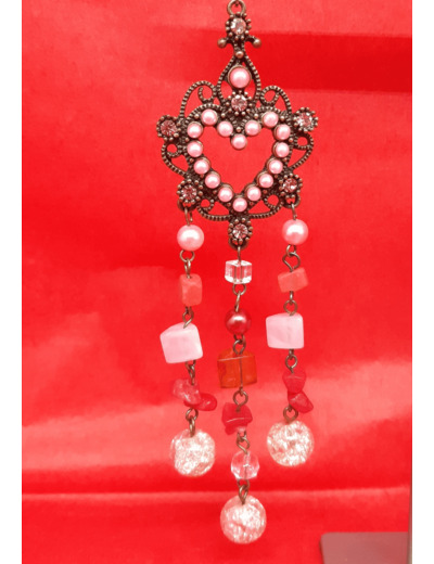 Longue paire de boucles d'oreilles formant coeur en perles rosées d'où pendants des chainettes en perles rondes et carrées
