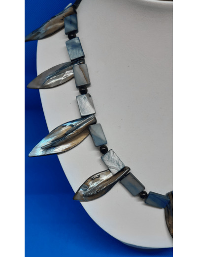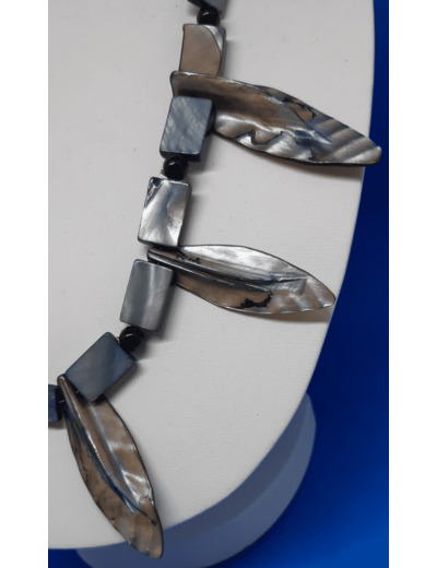 Intéressant collier ras du cou en nacre arborant un décor de feuilles , à la manière de trophées