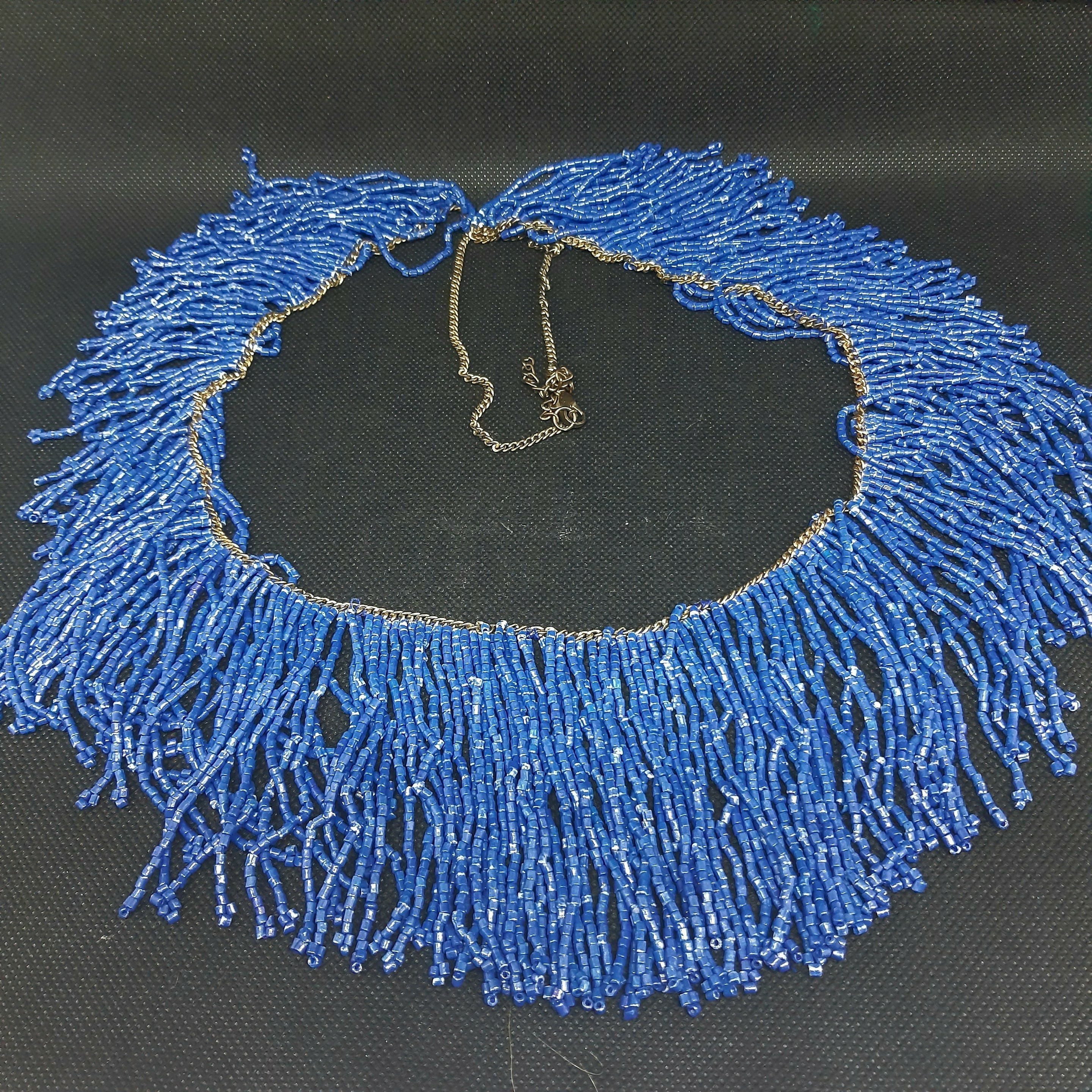 Spectaculaire sautoir présentant des franges d'une multitude de perles bleues, formant comme un plastron