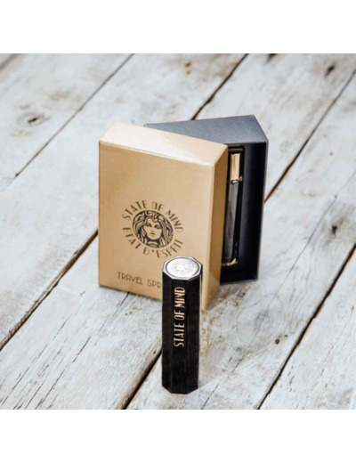 Le flacon 20 ml du parfum d’exception de la maison STATE OF MIND est un flacon octogonal qui s’ouvre à la façon d’un rouge à lèvres. Son design luxueux, dans le style ART DECO, est sublimé par un personnage d’une Vestale sur le bouton poussoir. Il s’agit du logo de la marque inspiré par Alphonse Mucha et exprimé dans le style Art Déco.