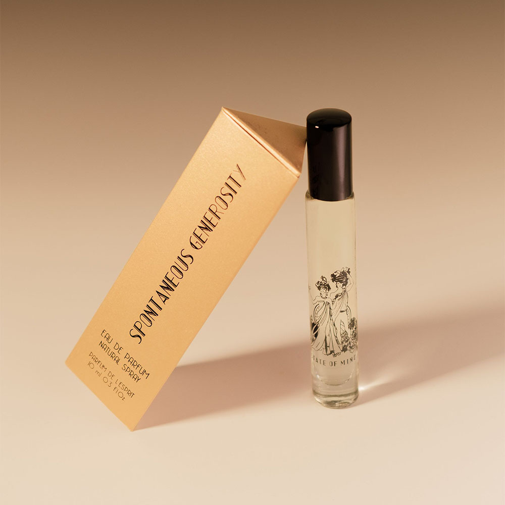 Le spray 10 ml SPONTANEOUS GENEROSITY a un emballage ludique et géométrique doré, dans le style Art Déco. Les flacons portent les illustrations des Etats d’Esprit qui leur correspondent. C’est le nouveau format de parfum de la Maison State of Mind, exclusivement vendu sur le site de la marque. Il a été conçu dans l’esprit « on the go » avec le format réduit et remplissable. Vous pouvez facilement le transporter dans un sac à main ou un sac de voyage.