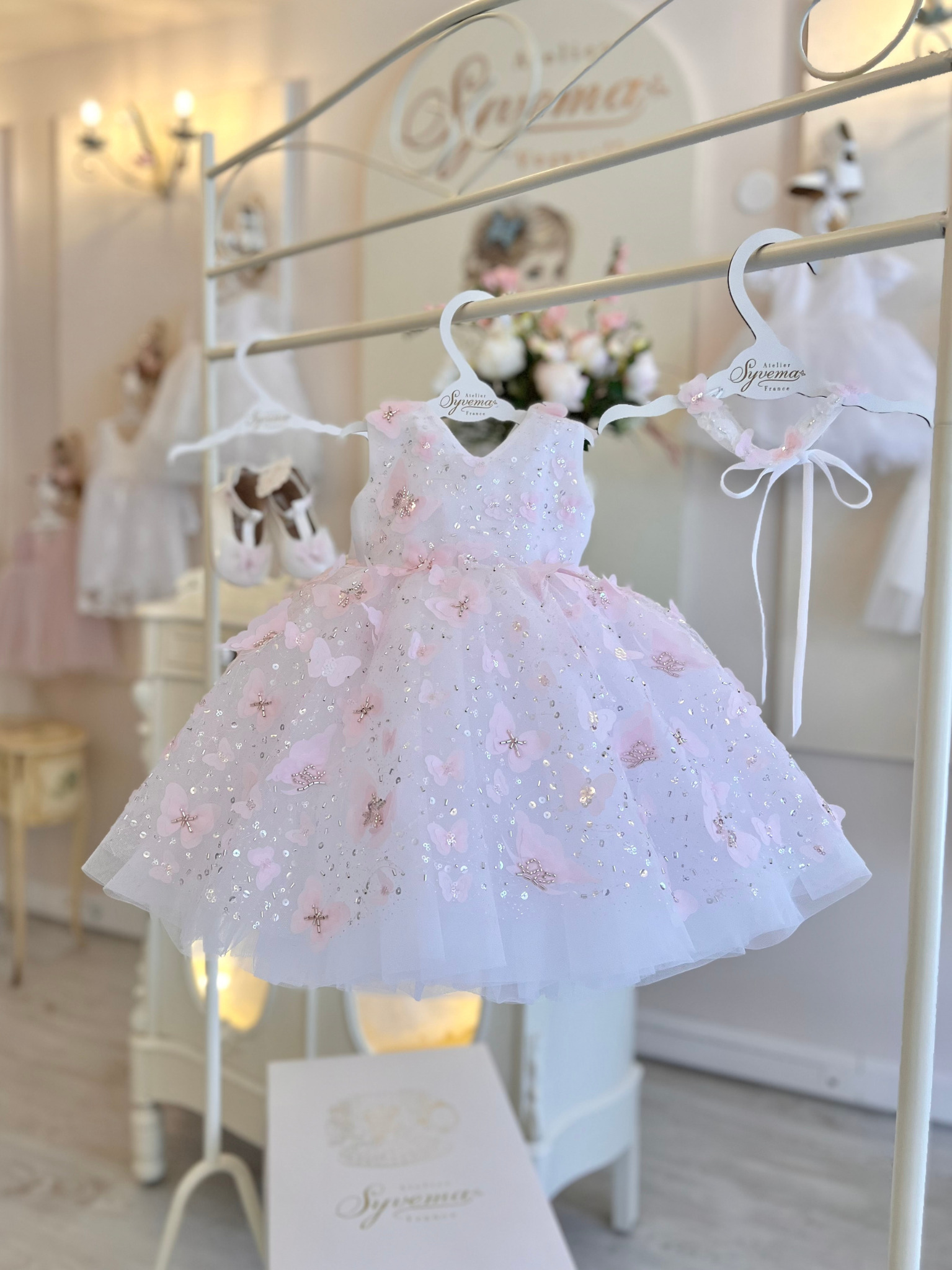 The price includes sweet matching hair accessories, and coordinating shoes are available to complete the look.