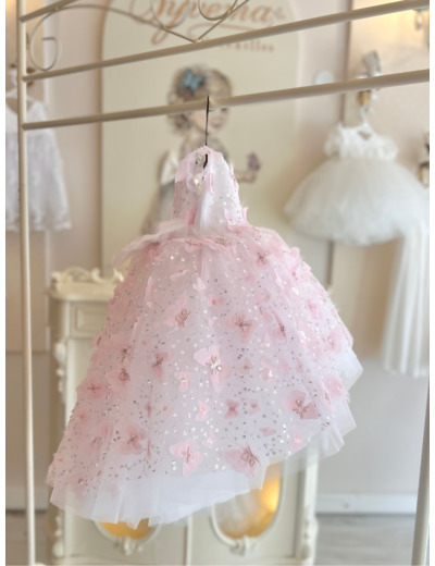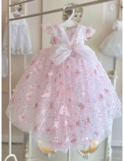 This adorable baby dress made with a organza top and gorgeous lace adorned with 3D butterflies, beads, and sequins, it’s sure to make her shine.