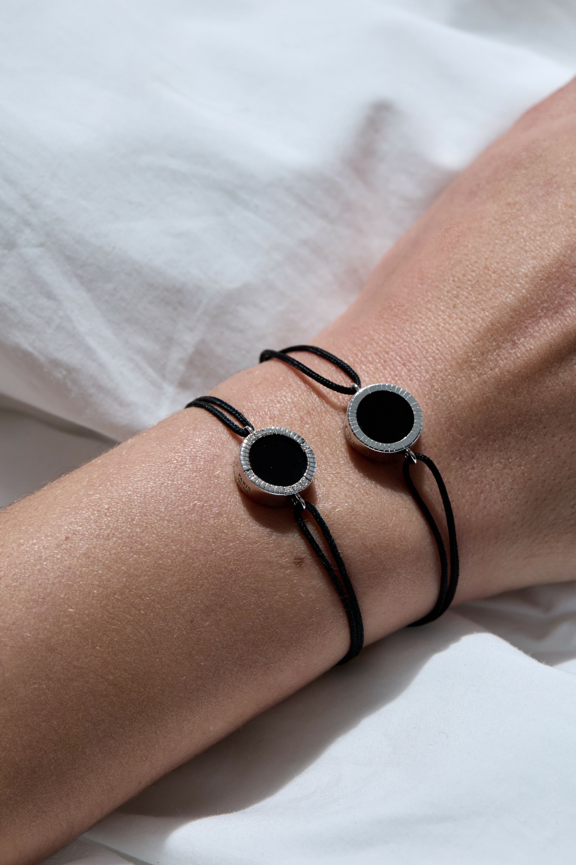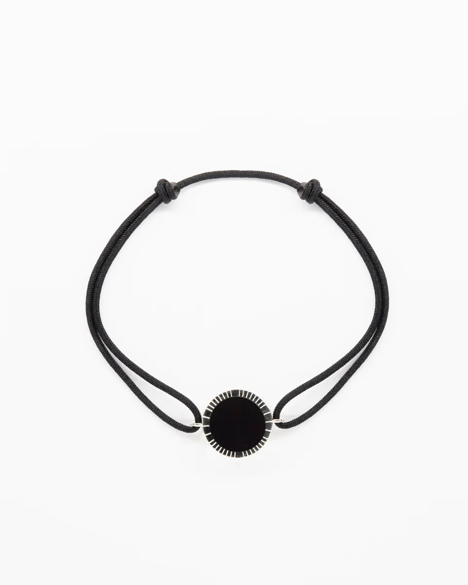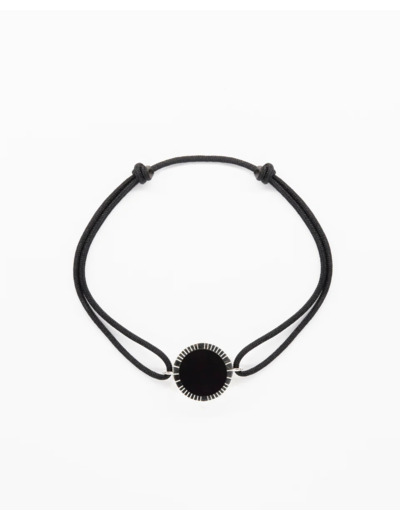 La composition du bijoux allie une Agathe noire et un anneau en Or blanc 18K. Le cordon est noir.